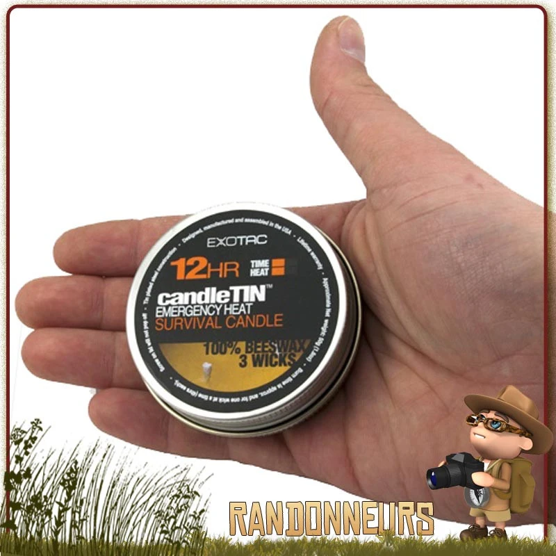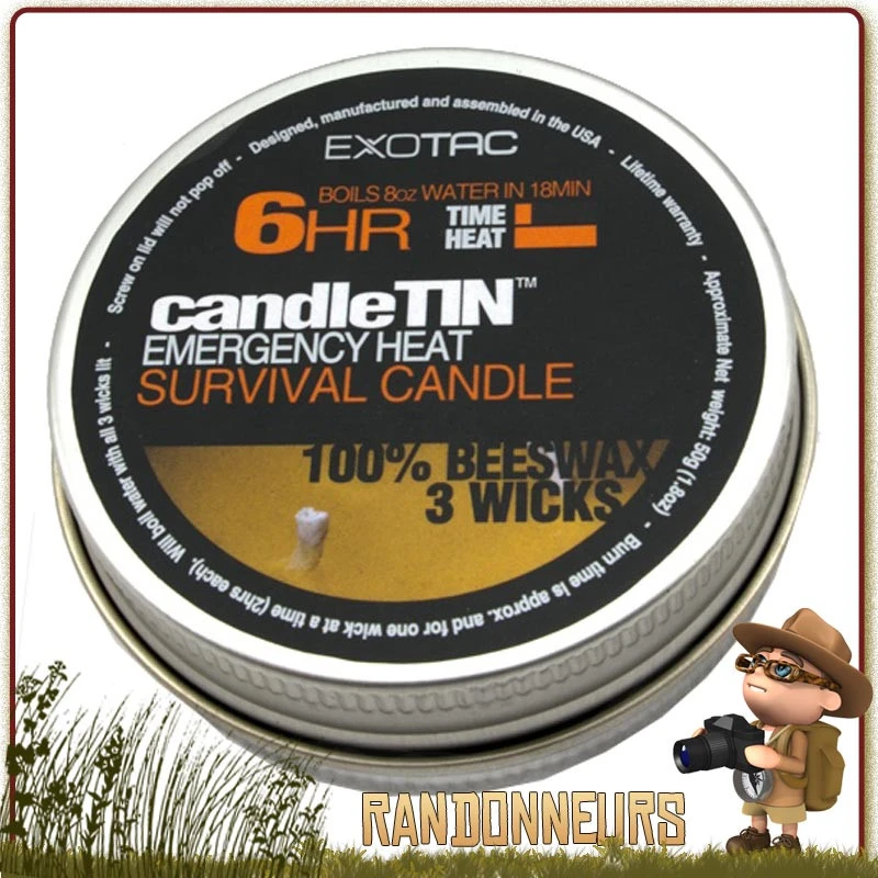 Bougie de survie CandleTIN Exotac, en cire d’abeille, avec trois mêches indépendantes, le tout dans une boite aluminium étanche et robuste.