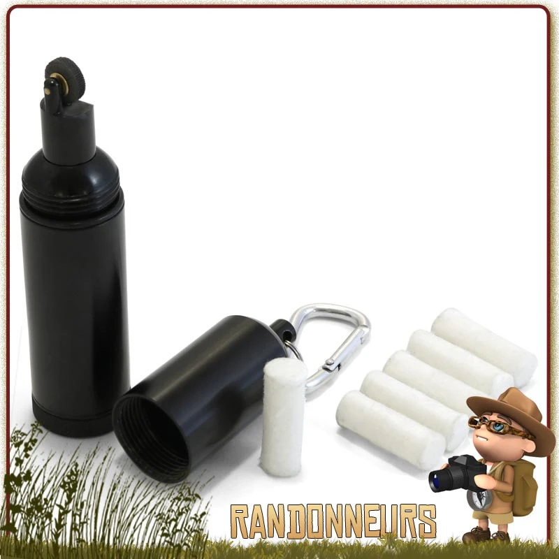 Conteneur aluminium étanche, avec les accessoires pour allumer un feu (briquet pierre à feu, tampon ouaté).