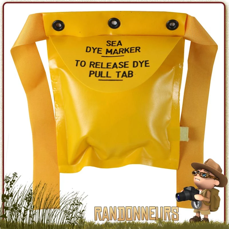 Le colorant de détresse mer ou neige BCB est une poche en PVC qui contient environs 104 g de produit colorant fluorescent jaune/vert, qui se rependra rapidement lorsque le produit sera dissout dans l’eau ou sur de la neige.