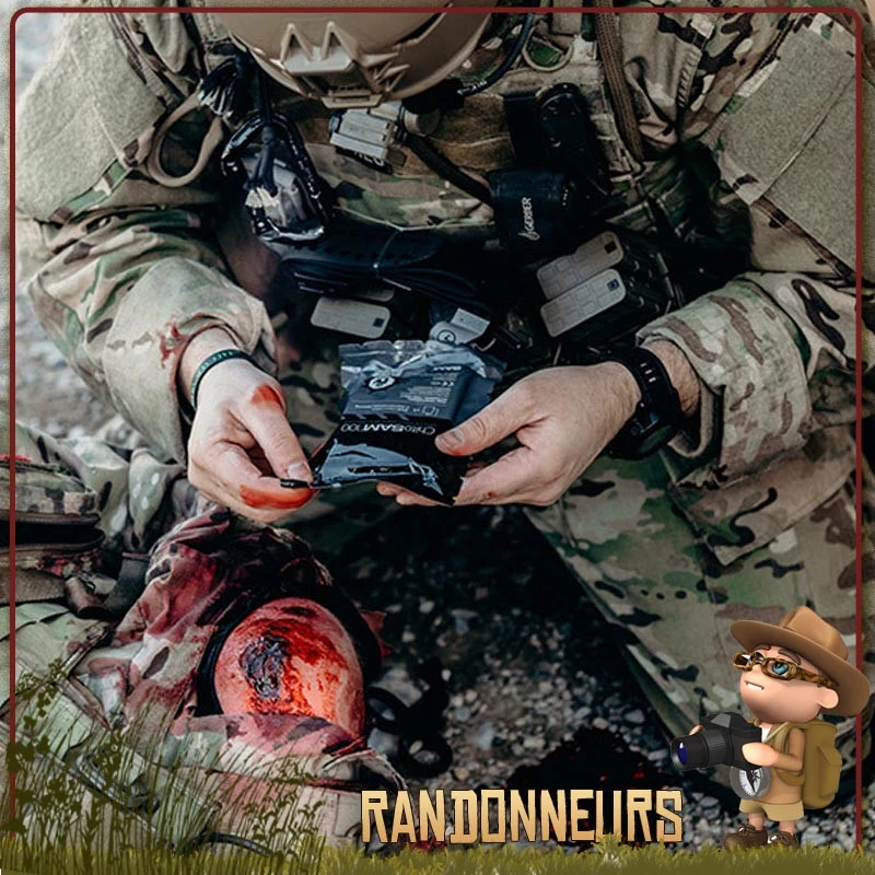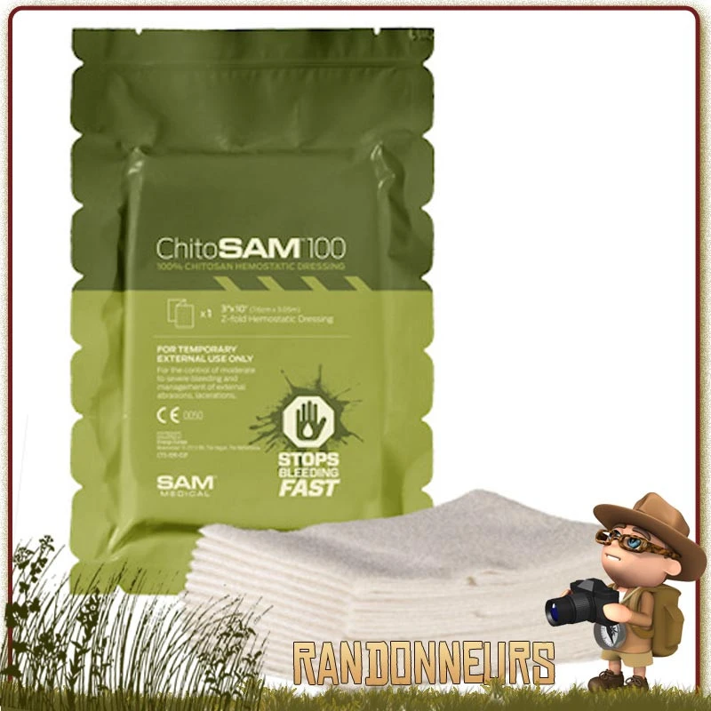 Conditionné sous emballage étanche, individuel et stérile, la compresse Chito Sam 100 permet un accès facile du pansement de soins d’urgence sur une plaie ouverte sur le terrain
