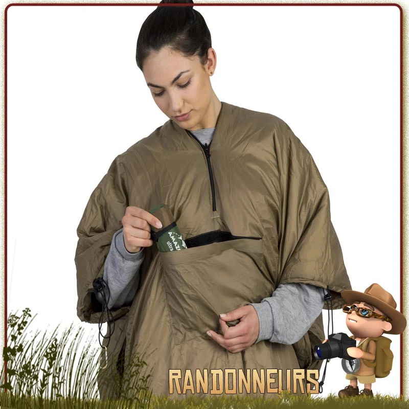 Couette Poncho Couverture Underquilt Amazonas, à placer juste au dessous de votre hamac, il vous est possible d’être protégé du froid et du vent au niveau de la base de votre corps. Un complément important pour bien avoir chaud dans un bivouac bushcraft d’hiver avec un hamac. Pratique, s’utilise également comme poncho bien chaud