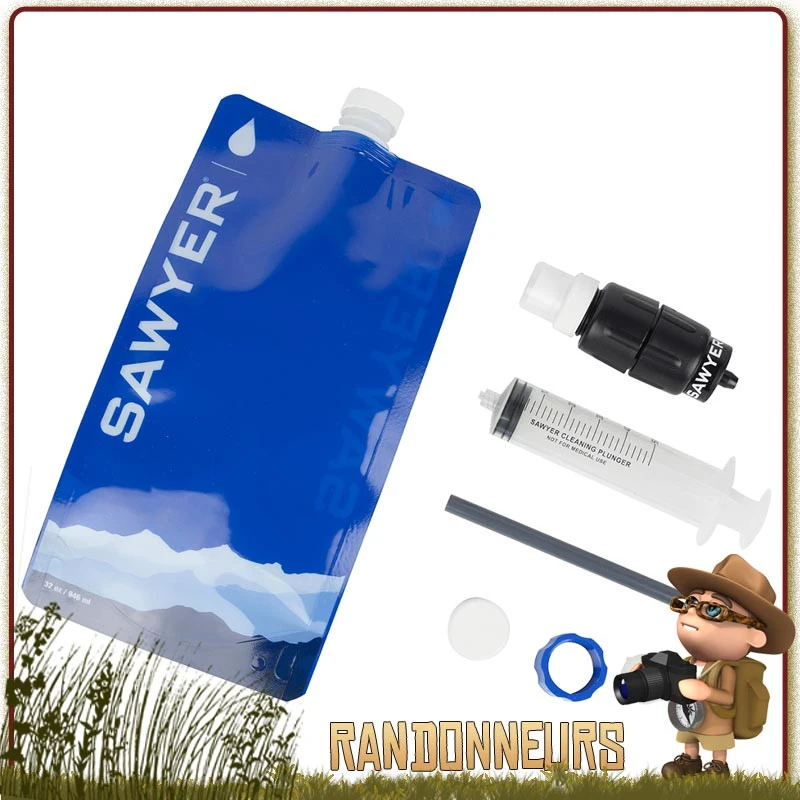 Paille Filtrante Micro Squeeze Sawyer avec gourde souple, seringue, tube souple plastique, bague vissante, joint de rechange