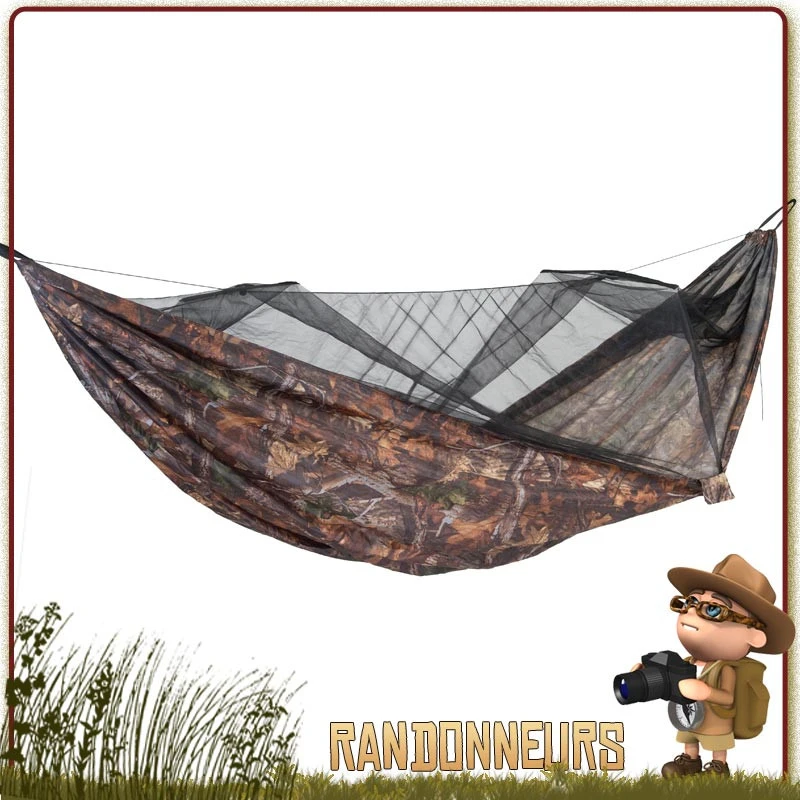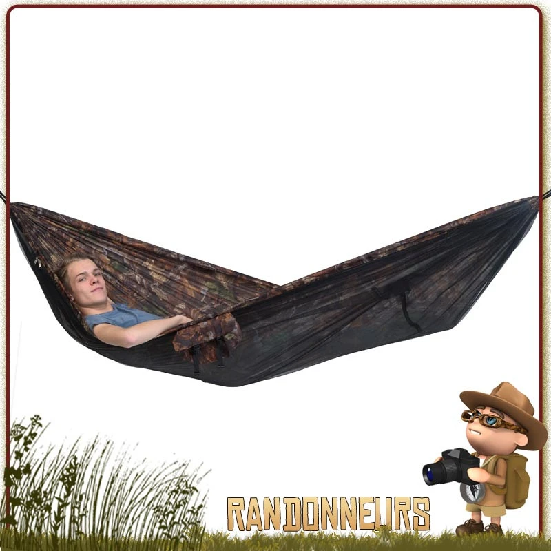 Hamac de randonnée camouflage Forest bushcraft et jungle, le Hamac Mosquito Traveller Amazonas est complet car il comporte une moustiquaire intégrée pour la protection contre les insectes.