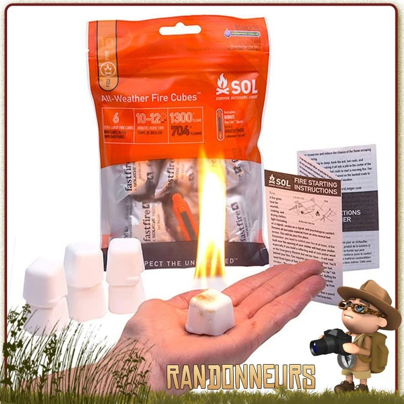 La matière non toxique des cubes allume feu SOL est l’accompagnement idéal à tout allume-feu, et peut vous aider à obtenir une flamme même sous une pluie torrentielle et en plein vent