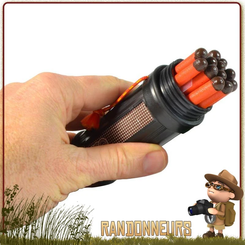 Boite étanche et robuste, en plastique, avec grattoir intégré, et 12 allumettes de survie tout temps.