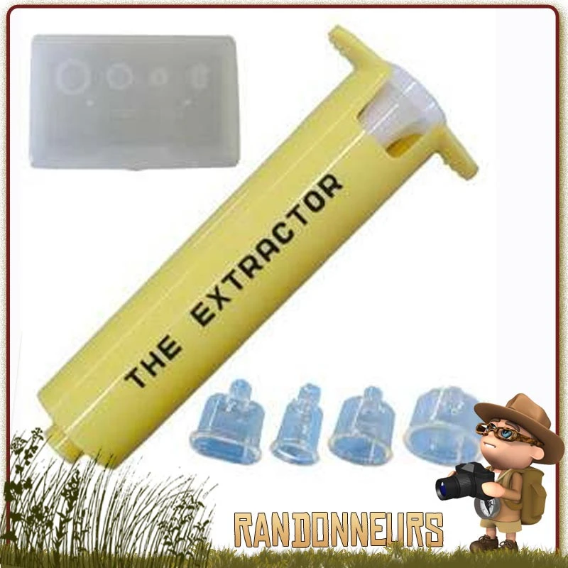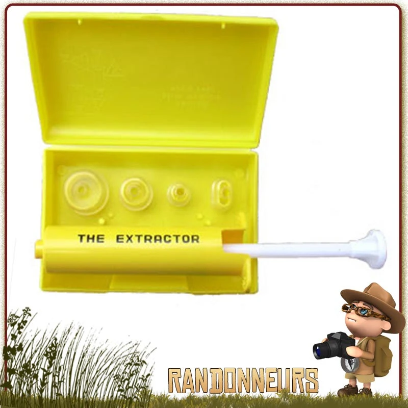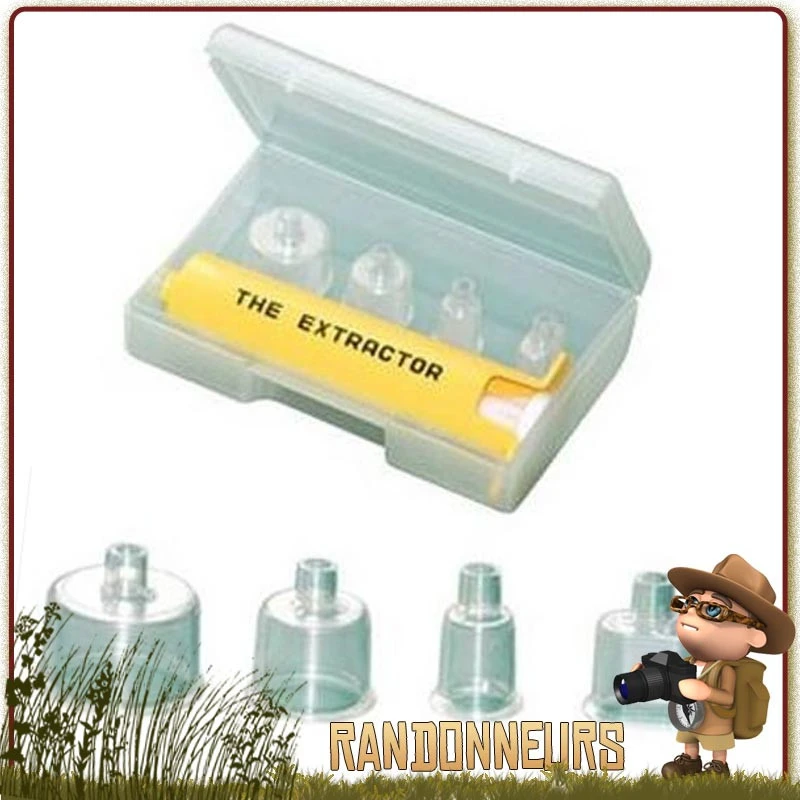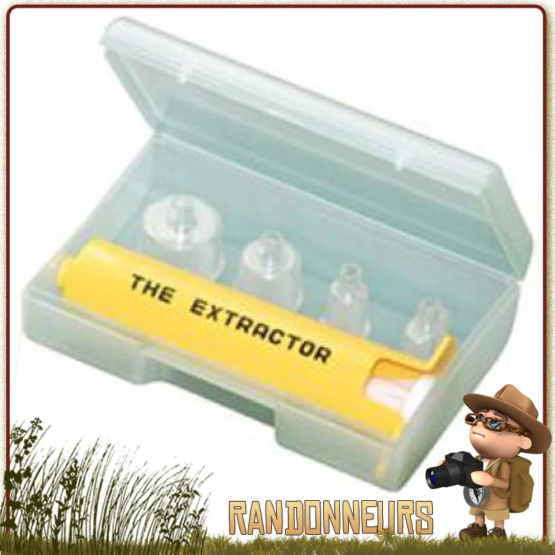 Extractor, kit pour piqure et morsures, léger, compact et peu encombrant, maniable d’une seule main et réutilisable.