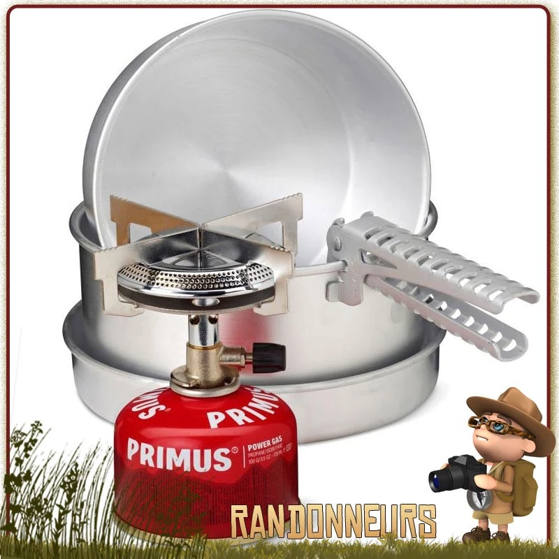 Kit Réchaud gaz Mimer Primus avec popote aluminium (2x casserole, 1x poêle, 1x pince) et une housse de rangement