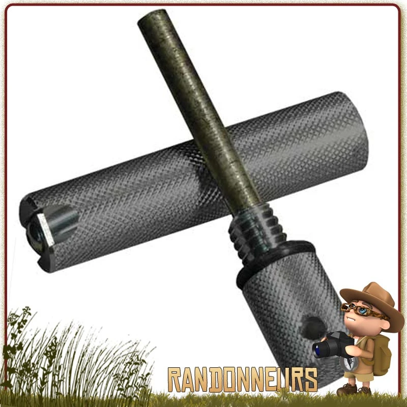 La tige de magnésium ferrocérium est capable de produire des gerbes d’étincelles pouvant avoir une température de près de 3000 degrés, ce qui permet d’enflamer n’importe quel amadou (coton,feuilles, brindilles, écorce) en vue de faire un feu en pleine nature.