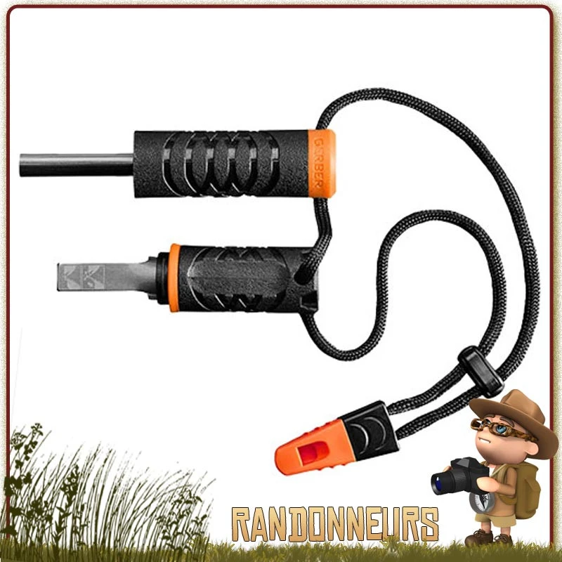 Le fire starter Gerber est une tige ferrocérium protégée dans un tube étanche, avec grattoir efficace, sifflet de signalisation, lanyard