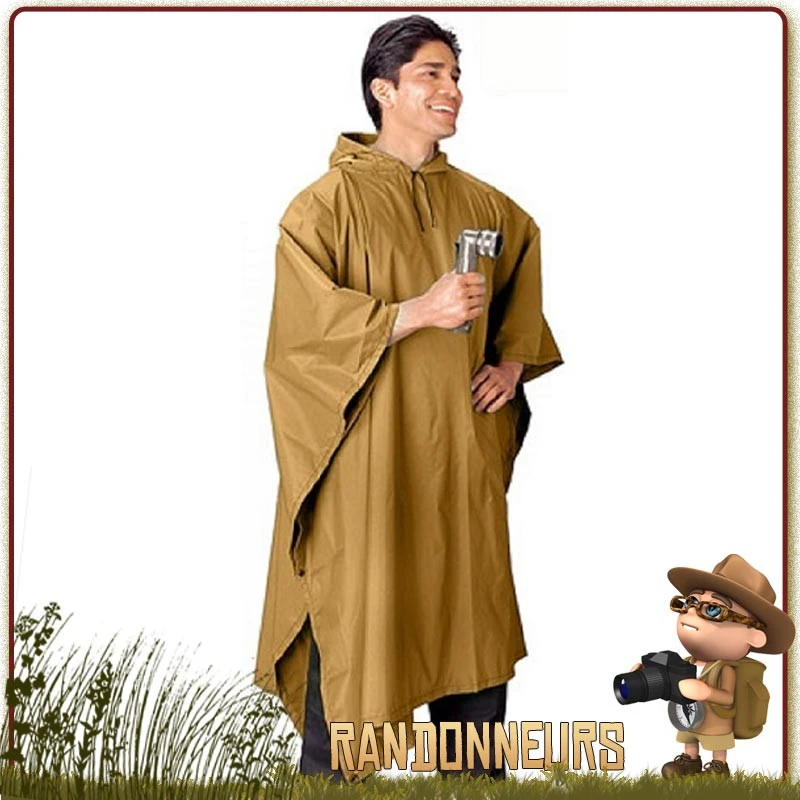 Poncho Toile Ripstop Polyester enduction PU avec œillets qui vous protègera efficacement contre la pluie et les coups de vents