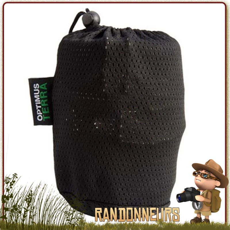 Il est possible d’intégrer dans la casserole, un réchaud de randonnée légère Crux Lite, une cartouche de gaz butane de 100 g et un couvert titane repliable optimus.