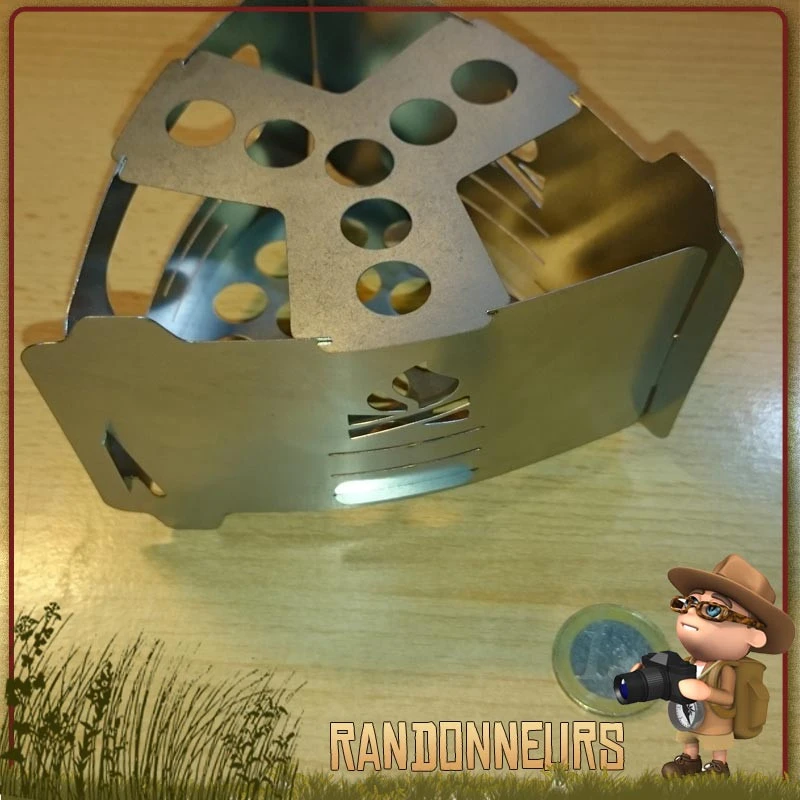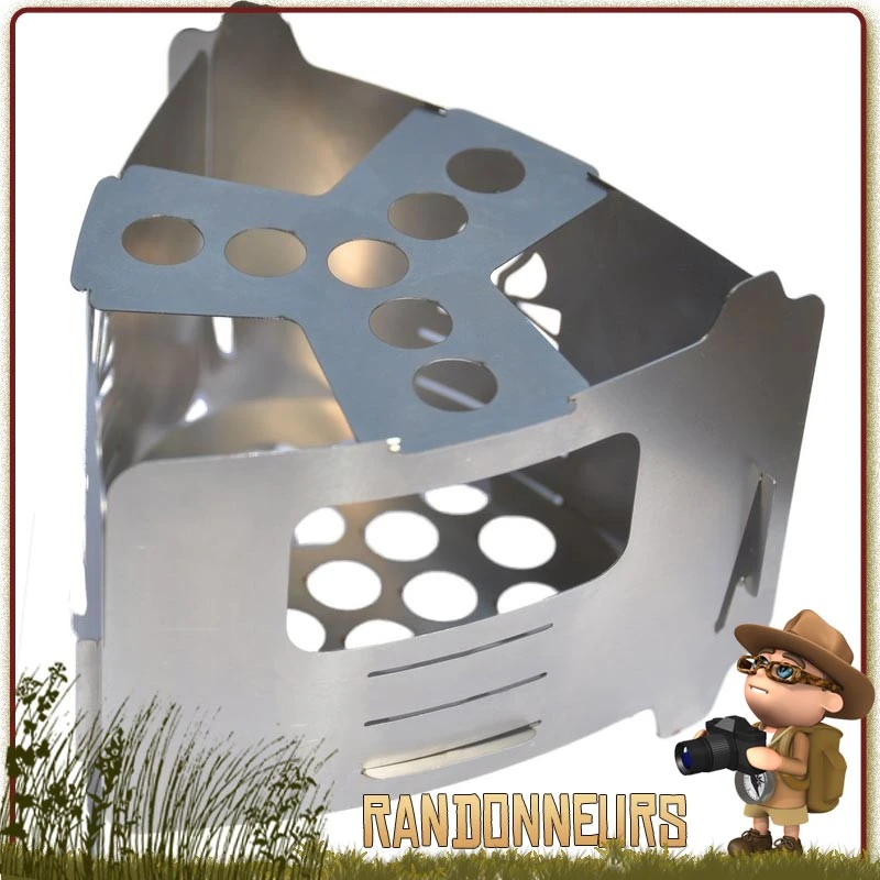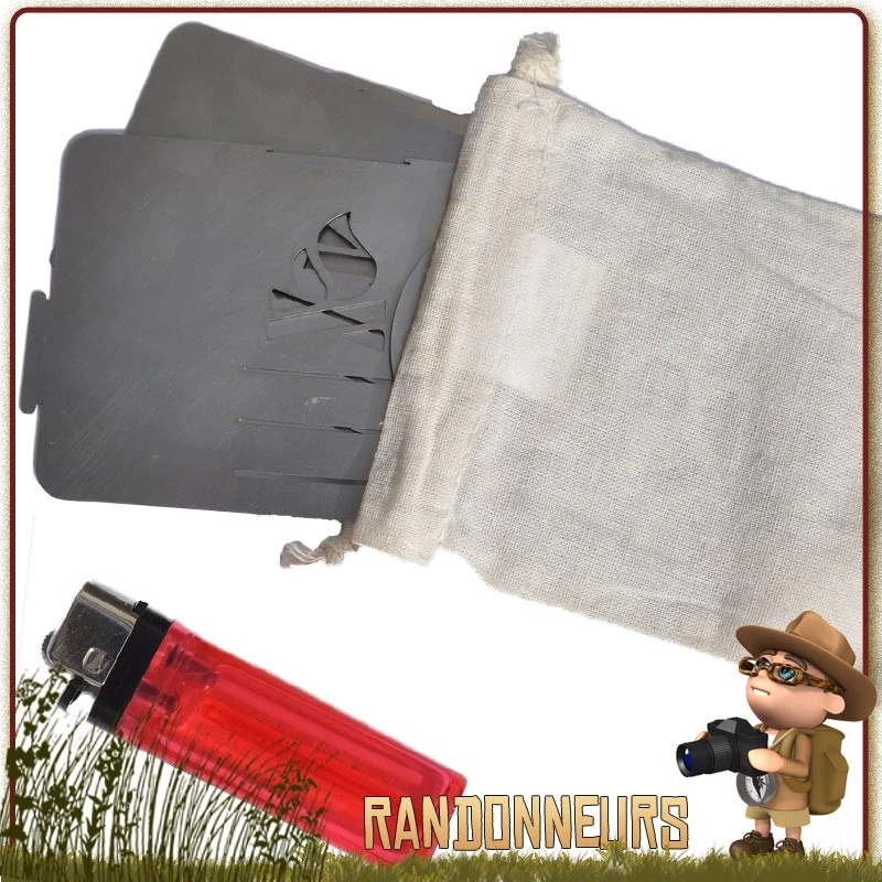 Réchaud Bushcraft d’une simplicité absolue, efficace et léger, comportant trois positions possibles pour la plaque de base, support de votre combustible