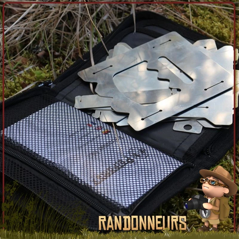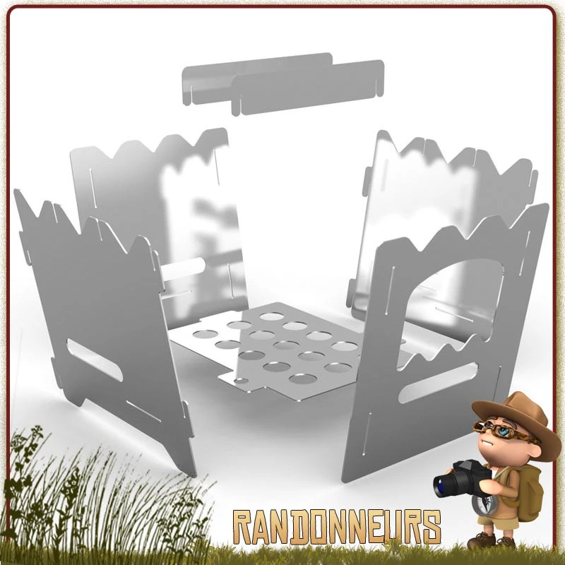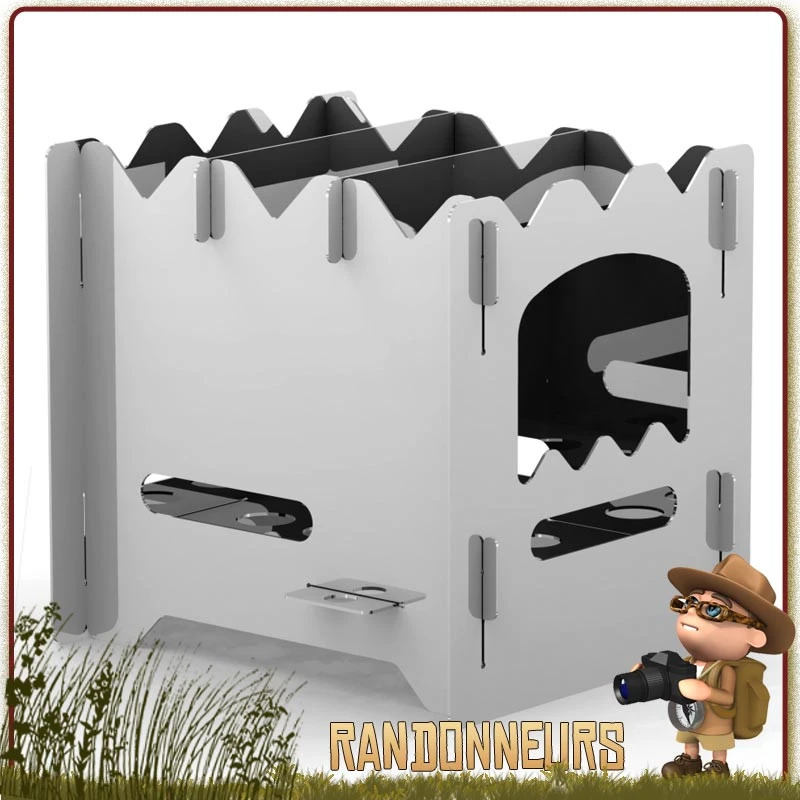 Réchaud bois (ou multi combustible) ultra compact, puisqu’il est entièrement démontable et se range très facilement dans une poche (19 x 16 x 3 cm démonté), ou dans un kit de survie.
