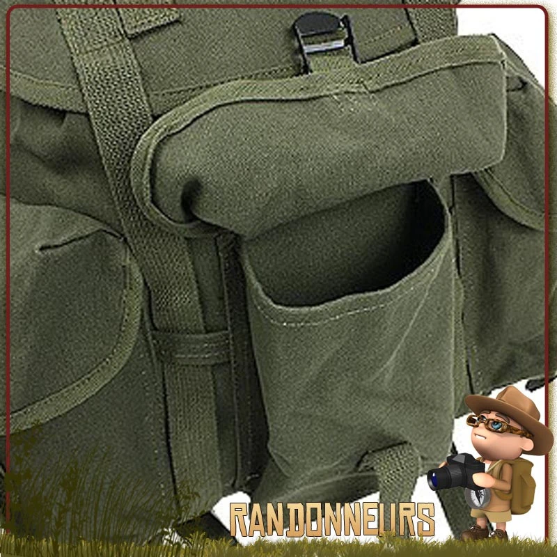 Trois grandes poches frontales (10 x 10 x 20 cm) pour un meilleur rangement de votre équipement bushcraft.