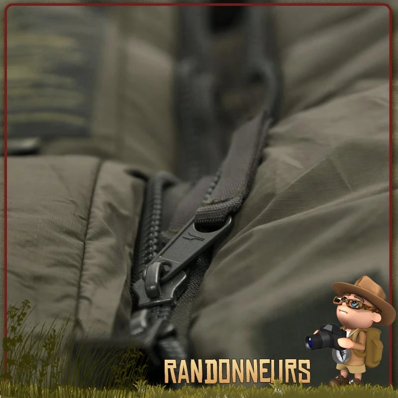 Pour une meilleure isolation, la fermeture Ă glissière du sac de couchage DEFENCE 6 Carinthia est doublĂ©e d’un rabat extĂ©rieur dotĂ©e d’un bourrelet gĂ©nĂ©reux pour empĂŞcher toute dĂ©perdition de chaleur.