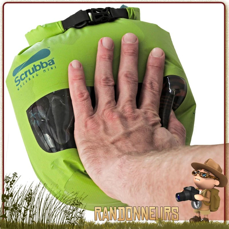 Laver efficacement son linge en randonnée légère et voyage, le Scrubba mini permet de faire la lessive pour deux personnes avec seulement 3 litres d’eau à température maximale de 50°C.