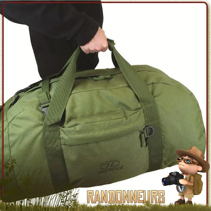 Sac de transport Highlander avec large compartiment intérieur, poignées renforcées, 2 poche zippée sur chacun des côtés et sangles de compression très pratiques.