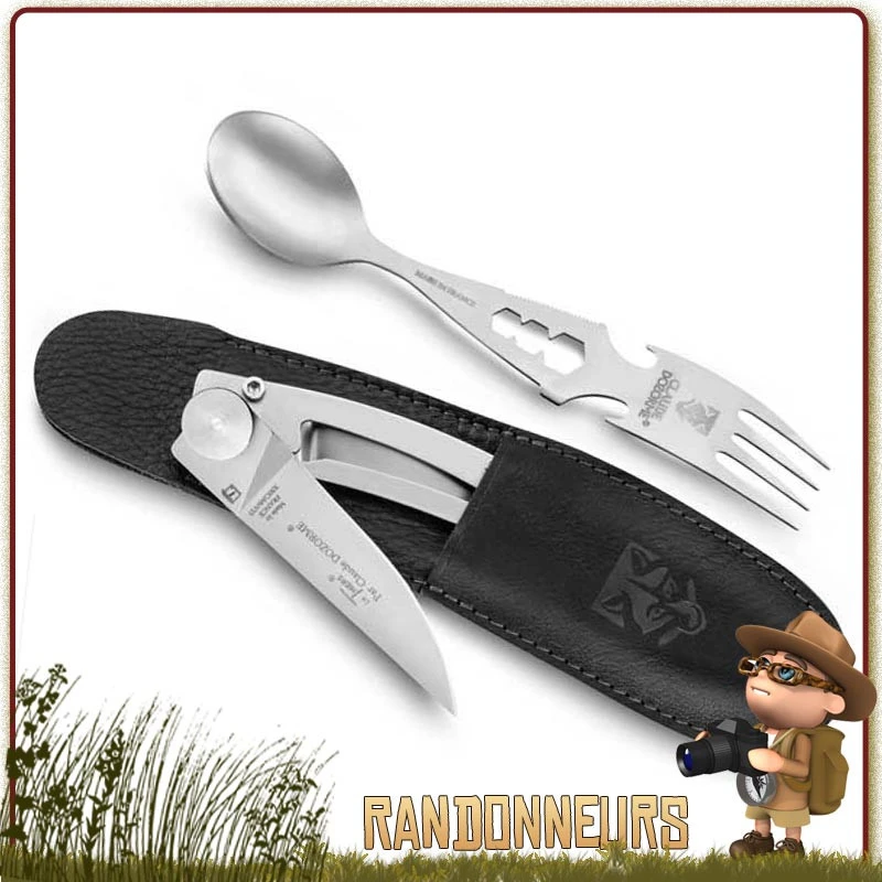 Set Couvert de camping original, le combo couteau Thiers et Forkspinner est une judicieuse combinaison entre un couteau de randonneur léger et une fourchette cuillère agrémentés d’un tournevis, d’un décapsuleur, clés Hex (H M6, M5 et M4) ainsi que des micro dentures en guise de couteau de dépannage.