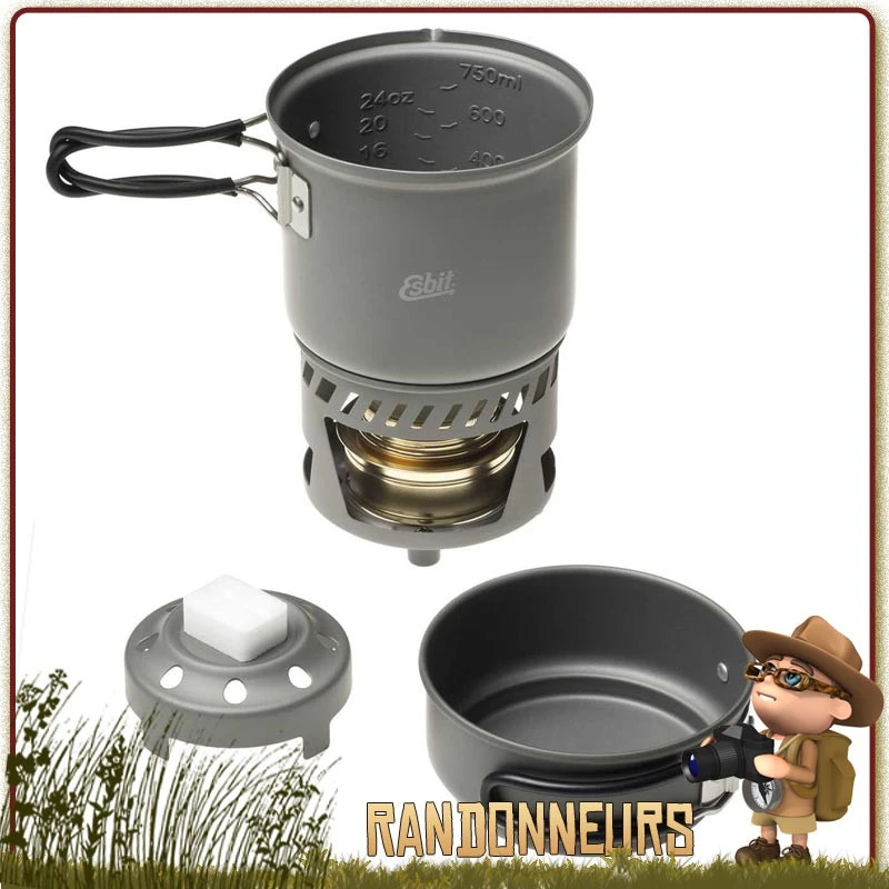 Set de cuisine pour randonner léger, Set de cuisson ESBIT CS985NS comprenant un réchaud brûleur alcool ultra léger et une popote aluminium anodisé revêtement anti adhésif de 985 ml.
