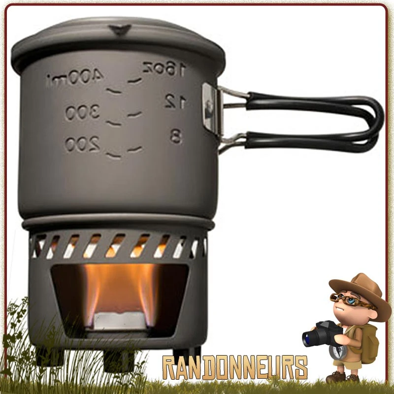 Le support de la popote permet de déposer une tablette de combustible solide Esbit ou de gel éthanol type DragonFire et fait office de pare-vent.