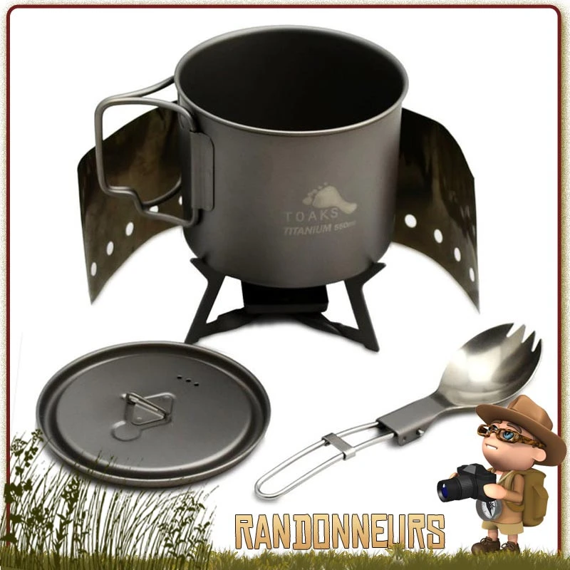 Combinaison parfaite entre un mini réchaud alcool solide, un pot de 550ml, un pare-vent et un cuillère spork titane pliante, un atout pour le trek et la randonnée