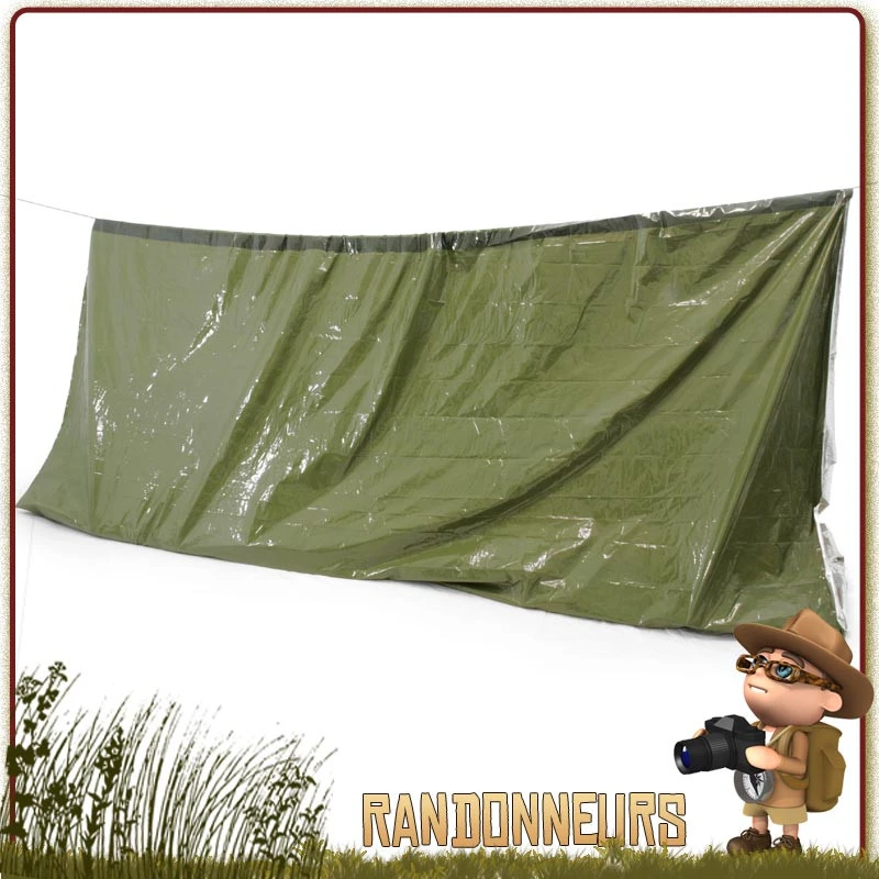 Tente abri de survie en toile robuste polyéthylène avec revêtement argenté pour assurer le maintien de la chaleur corporelle.