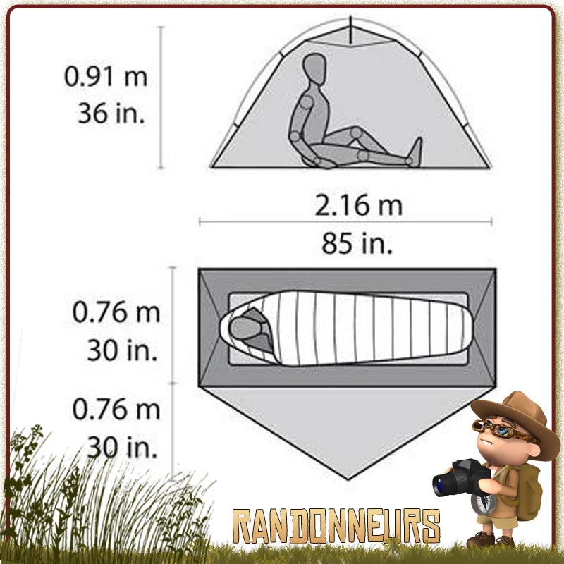 La configuration spéciale des arceaux, qui forment un dôme, permet de maximiser la hauteur de l’habitacle pour la tête (91 cm de hauteur au centre pour cette tente MSR Hubba NX Grise), et la largeur aux coudes sur toute sa longueur.